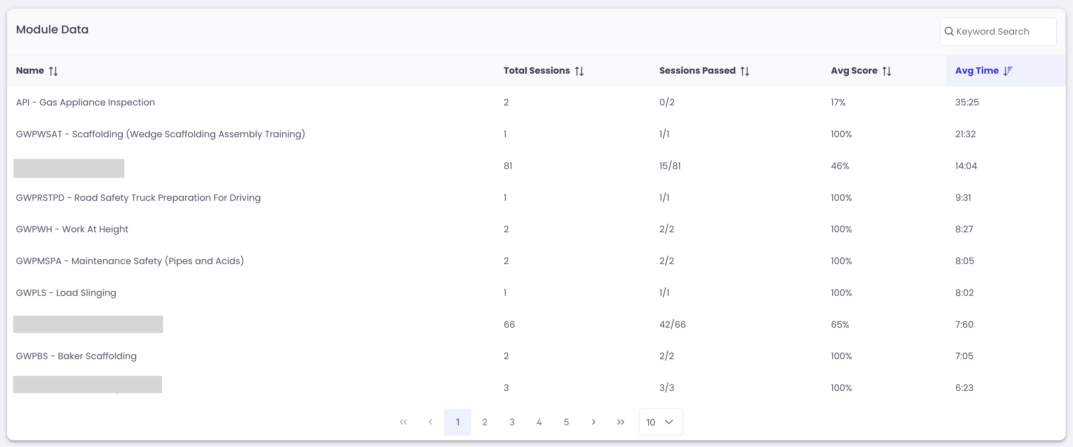 Scroll down to the "Module Data" panel to see total sessions, sessions passed, average score and average time for your organization's modules.