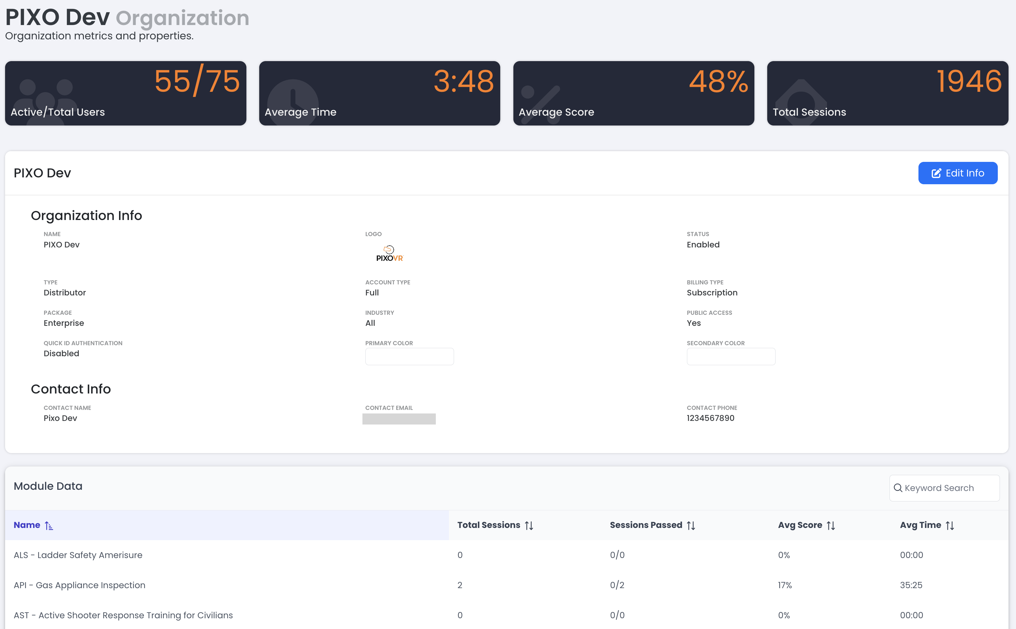 Use the Organization Tab to view your organization's metrics. From this page you can edit your organization's info and view module data.