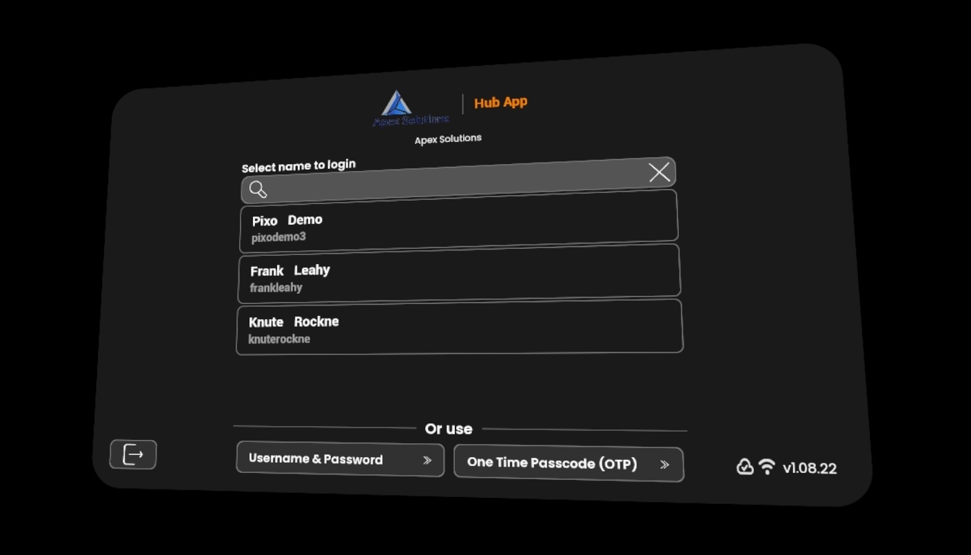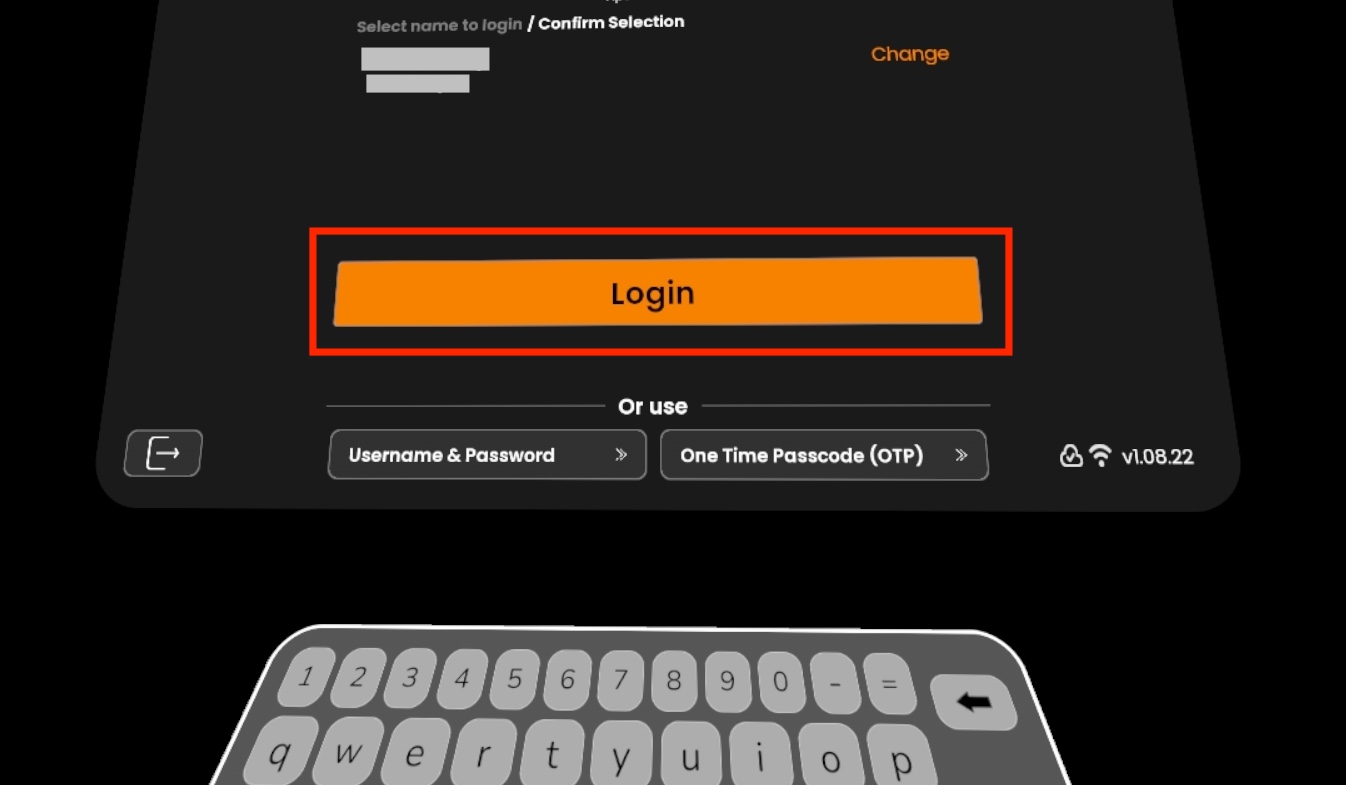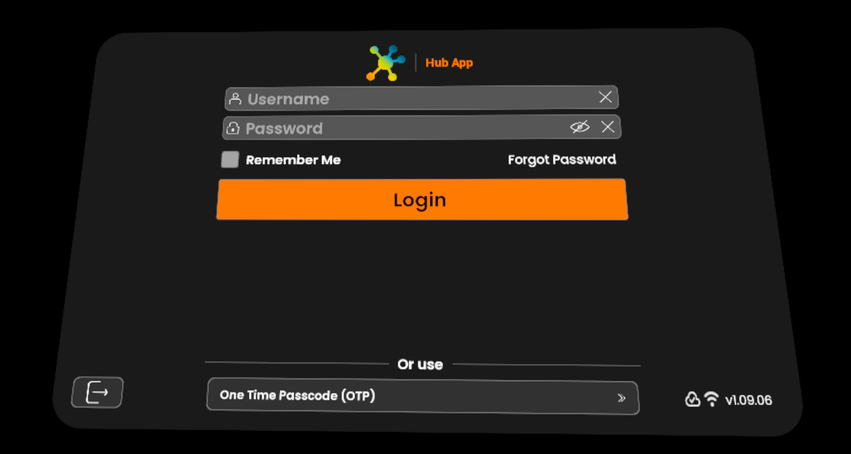 Open the Hub App in headset and select "One Time Passcode (OTP)" at the bottom of the login screen: